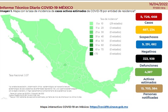 Con ello se suman 5 millones 726 mil 668 casos desde el inicio de la pandemia.