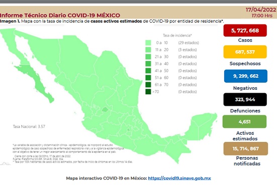 Este domingo se reportaron mil nuevos casos de Covid-19, con los que se acumula un total de 5 millones 727 mil 668 contagios; en tanto, 323 mil 944 personas han fallecido como consecuencia de esta enfermedad y de ellos, 6 fueron reportados en las últimas 24 horas.