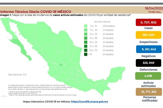 Este lunes se reportaron 164 nuevos casos de Covid-19, con los que se acumula un total de 5 millones 727 mil 832 contagios; en tanto, 323 mil 949 personas han perdido la vida como consecuencia de esta enfermedad y de ellas, 5 fueron reportadas en las últimas 24 horas.