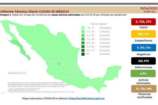 Este martes se reportaron mil 438 nuevos casos de Covid-19, con los que México acumula un total de 5 millones 729 mil 270 contagios; en tanto, 323 mil 973 personas han fallecido como consecuencia de esta enfermedad y de ellas, 24 fueron reportadas en las últimas 24 horas.