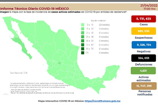 Este jueves se reportaron mil 75 nuevos casos de Covid-19 con los cuales se acumulan 5 millones 731 mil 635 mil contagios; en tanto 324 mil 33 personas han fallecido a causa de esta enfermedad y de ellas, 29 fueron reportadas en las últimas 24 horas.