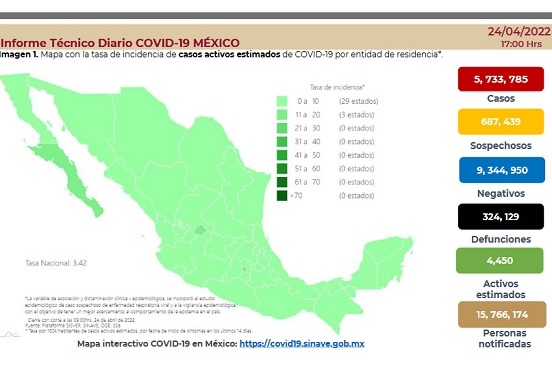 La Secretaría de Salud reportó 271 nuevos casos de Covid-19, con los que México acumula un total de 5 millones 733 mil 785 contagios; en tanto, 324 mil 129 personas han fallecido como consecuencia de esta enfermedad y de ellas, 12 fueron reportadas en las últimas 24 horas.