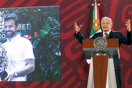 “¡Basta de hipocresía!”, expresó López Obrador luego de mostrar una fotografía de la cual comentó que el actor estaba en una inauguración de un hotel de Xcaret; no obstante, la imagen es del reconocimiento Xcaret que los organizadores de los Premios Platino y el Hotel Xcaret México, entregaron en abril de 2018 al actor de cintas como Coda, Cómo ser un Latin Lover, entre otras.