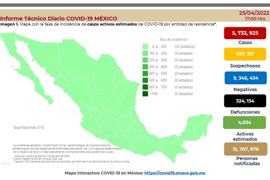 De esa manera, la Secretaría de Salud reportó este día 140 nuevos contagios de Covid-19, con los que se acumula un total de 5 millones 733 mil 925 casos; en tanto, 324 mil 134 personas han fallecido como consecuencia de esta enfermedad y de ellas, 5 fueron reportadas en las últimas 24 horas.