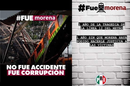 A través de sus redes sociales, el Comité Ejecutivo Nacional (CEN) del tricolor inició una campaña con la etiqueta #FueMorena en la que hace referencia a la caída del tren del Metro en la Estación Los Olivos de la Línea 12, y denuncia que Morena demostró que no está del lado de las víctimas.