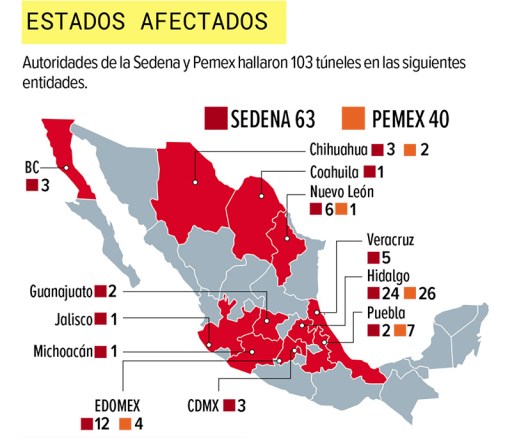 En el reporte, que conjunta información de Petróleos Mexicanos (Pemex) y la Secretaría de la Defensa Nacional (Sedena), se detalla que Hidalgo es la entidad federativa en la que se halló el mayor número de túneles.