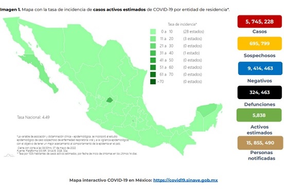 En su reporte semanal, la Secretaría de Salud (Ssa) reportó 5 mil 548 nuevos casos de Covid-19, con los que se acumulan un total de 5 millones 745 mil 228 contagios en lo que va de la pandemia; en tanto, 324 mil 463 personas, han perdido la vida como consecuencia de esta enfermedad y de ellas, 129 fueron reportadas en la última semana.