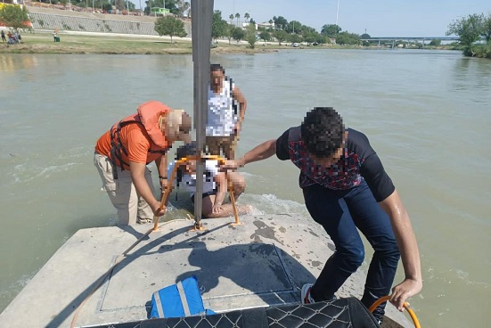 Al lugar conocido como paseo del río, entre los puentes internacionales I y II, llegó personal de Grupo Beta Piedras Negras y con una maniobra de rescate en un aerobote auxiliaron a las personas migrantes de la situación de riesgo.