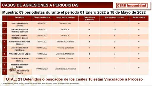 “Señalar que en lo que va del año van nueve casos (periodistas asesinados). Se ha dicho que son 11, nosotros señalamos que son nueve porque todos están soportados en actuaciones ministeriales de las Fiscalías y en testimonios de familiares de las víctimas, quienes refirieron cuál era la principal actividad de sus familiares victimados”, dijo el funcionario.