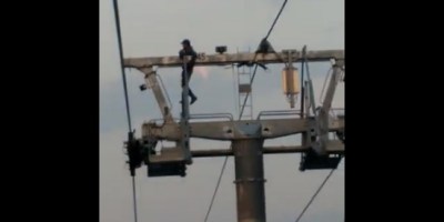 Hombre escala a lo alto de una torre del Cablebús en Iztapalapa