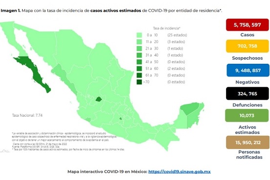 En una semana se reportaron 7 mil 18 nuevos casos de Covid-19, con los que México acumula un total de 5 millones 758 mil 597 contagios; en tanto, 324 mil 7645 personas, han perdido la vida como consecuencia de esta enfermedad y de ellas, 154 fueron reportadas en la última semana.