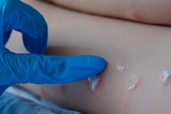 Luego aparecen erupciones (en la cara, las palmas de las manos, las plantas de los pies), lesiones, pústulas y finalmente costras.
