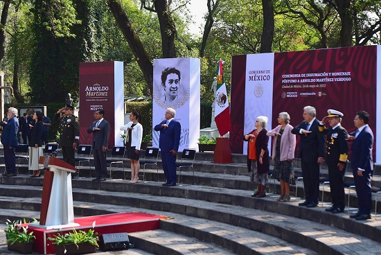El mandatario depositó una ofrenda floral y montó guardia de honor en memoria de Arnoldo Martínez Verdugo.