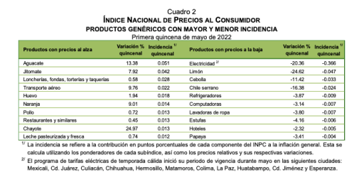 Mientras que el aguacate incidió en la alza en la inflación con un aumento del 13.38%; el jitomate con 7.92%, el huevo con 1.94%; la naranja con 9.01%; el pollo con 0.72%; el chayote con 24.97%, entre otros.