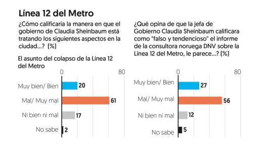 De acuerdo con el sondeo, 20 por ciento califica bien o muy bien la manera en que el gobierno de Sheinbaum ha tratado el asunto de la Línea 12, mientras que 61 por ciento la califica mal o muy mal. Al preguntar qué opinan de que la jefa de Gobierno calificara como “falso y tendencioso” el tercer informe de la consultora noruega DNV sobre la Línea 12, 27 por ciento calificó la acción como bien o muy bien, mientras que 56 por ciento opinó mal o muy mal.