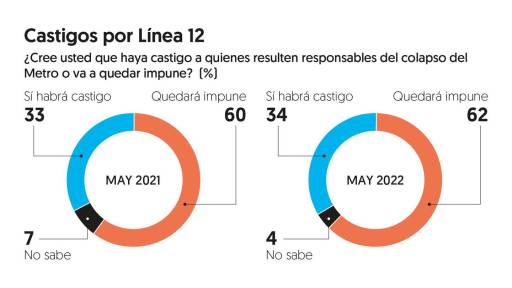 A un año de la tragedia, la opinión pública capitalina no ha cambiado de parecer respecto a si se castigará o no a los responsables del colapso: 34 por ciento cree que sí habrá́ castigo, mientras que una mayoría de 62 por ciento considera que quedará impune. En mayo de 2021 las proporciones de respuesta eran 33 y 60 por ciento, respectivamente; prácticamente iguales.