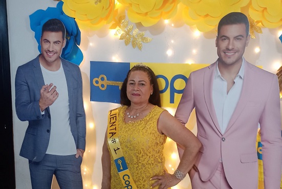 Con objetos de color azul y amarillo, aguinaldos con el logo de la empresa y hasta una tarjeta de crédito gigante –hecha de cartón–, la mujer festejó a lo grande su natalicio. Incluso, en una de las imágenes, la mujer aparece junto a la imagen de Carlos Rivera -quien ha promocionado la empresa-.