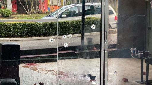 A fuera del Andromeda’s, quedó una mancha de sangre y seis impactos de bala en los espejos de la entrada al local.