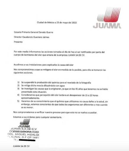 Padres de familia de los alumnos de la escuela primaria General Donato Guerra, ubicada en la colonia Miguel Hidalgo de la alcaldía de Tlalpan, piden la clausura de una fosa de desechos químicos de la empresa JUAMA S.A. de C.V., donde una fuga de gases a consecuencia de la fabricación del químico para el revelado de fotografía, ocasionó la intoxicación de al menos 15, de los cerca de 500 alumnos del centro educativo durante esta semana.