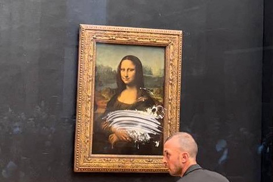 Esta tarde de domingo en el museo Louvre en París, Francia, un sujeto con peluca y en silla de ruedas lanzó un pastel a uno de los cuadros más famosos del planeta: La Gioconda.