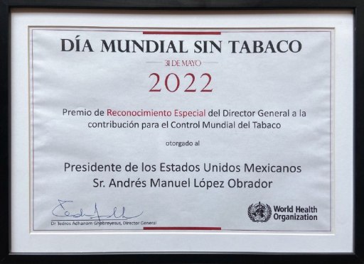 El presidente López Obrador fue galardonado este martes con un premio de reconocimiento especial al control del consumo de tabaco de la Organización Mundial de la Salud (OMS).