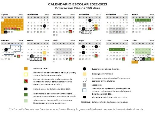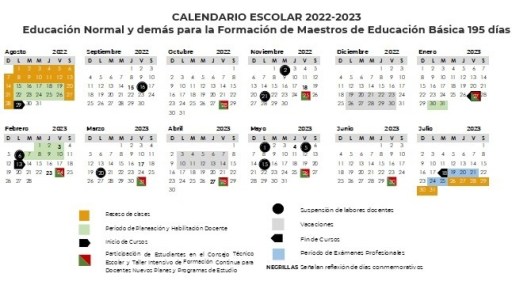 De acuerdo con la agenda de la SEP, las clases iniciarán el 29 de agosto de 2022 y concluirán el 26 de julio de 2023; además se establecen 13 sesiones de Consejo Técnico Escolar (CTE), así como dos periodos de vacaciones: el primero, del 19 al 30 de diciembre de 2022, y el segundo, del 3 al 14 de abril de 2023.
