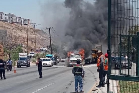 Una camioneta en llamas y fuera de control choca contra un camión, esto en una avenida de la ciudad de Tijuana, Baja California.