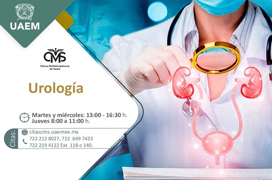El servicio de atención urológica en la CMS está abierto a la comunidad universitaria y público en general a través de una cita previa que se puede agendar en la plataforma Sistema de Citas Médicas en el enlace: https://citascms.uaemex.mx/, o llamando a los teléfonos 722 2128027 o 722 2194122 extensión:118 o 140.