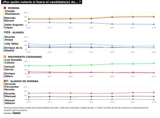 De acuerdo con el tracking diario realizado por SDPnoticias y MetricsMx, Adán Augusto López es el tercer candidato por parte de Morena y el último de las preferencias.