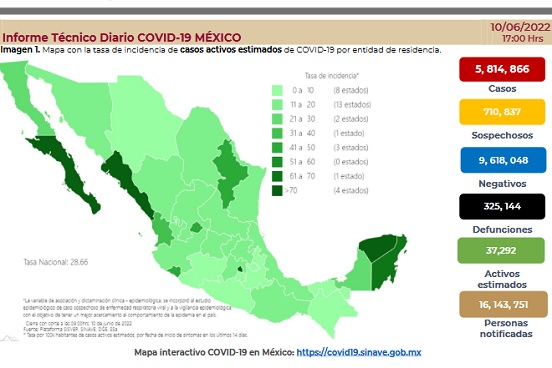 Agrega que la tasa de incidencia de casos activos es de 27 por cada cien mil habitantes, mientras que los estados con mayor reporte de contagios activos confirmados son Baja California Sur, Ciudad de México y Sinaloa.