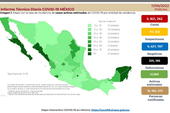 Los estados con la tasa más elevada de casos activos son Baja California Sur, Ciudad de México, Sinaloa, Yucatán, Quintana Roo, Colima, Nuevo León, Aguascalientes, Nayarit y Baja California. La tasa de incidencia es de 30.1 por cada cien mil habitantes, por lo que también mantiene su tendencia al alza.