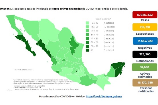 La pandemia activa se ubica en 37 mil 690 personas, la Ciudad de México con 11 mil 592 casos, Sinaloa con 3 mil 653, Estado de México con 2 mil 749 y Nuevo León con 2 mil 470, son las entidades con mayor número de casos activos que reportaron síntomas en los últimos 14 días.
