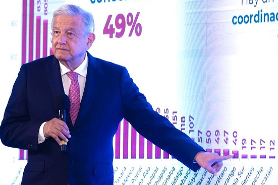 López Obrador agregó que son el Estado de México, Michoacán, Baja California, Zacatecas, Guanajuato, Sonora y Jalisco donde se concentra el 50 por ciento de los homicidios, “en seis de los 32 estados, y vamos avanzando”.
