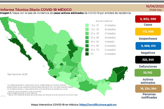 En las últimas 24 horas se confirmaron 9 mil 406 casos de covid-19 y 69 decesos. La pandemia sigue activa. Hasta hoy, el Sistema de Vigilancia de Enfermedad Respiratoria (SISVER) acumula 5 millones 852 mil 596 personas que han estado enfermas, de las cuales 325 mil 340 fallecieron por esta causa.