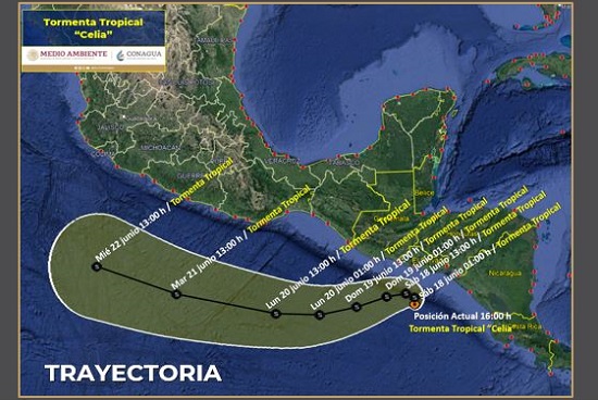 La depresión tropical Tres-E se intensificó a la tormenta tropical Celia en el Océano Pacífico a 235 kilómetros al sur de San Salvador, El Salvador, y a 450 kilómetros al sureste de la desembocadura del río Suchiate, en la frontera México-Guatemala.