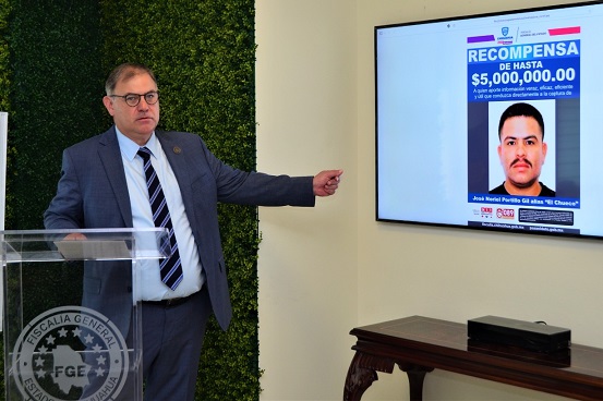 El fiscal del estado, Roberto Fierro, informó que la dependencia local ofrece “una recompensa de hasta 5 millones de pesos a quien o quienes aporten información veraz, eficaz, eficiente y útil que conduzca directamente a la captura de José Noriel Portillo Gil alias El Chueco”.