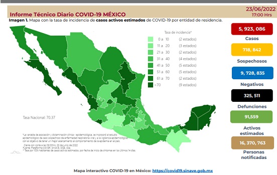 Cabe señalar que las 10 entidades que actualmente presentan la mayor tasa de casos activos por cada 100 mil habitantes son: Baja California Sur, Ciudad de México, Quintana Roo, Sinaloa, Yucatán, Nuevo León, Colima, Nayarit, Campeche y San Luis Potosí.