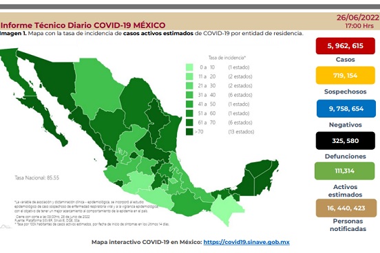 Este domingo la Secretaría de Salud (Ssa) reportó que 111 mil 314 personas tienen Covid-19 y se reportaron 5 mil 883 nuevos casos, con los que México acumula un total de 5 millones 962 mil 615 contagios desde el inicio de la pandemia.
