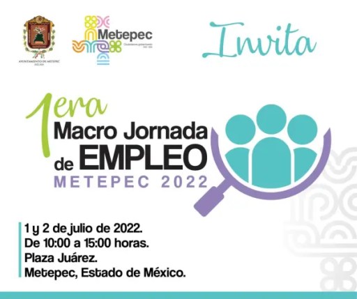 Con una oferta de poco más de mil 200 puestos laborales, este 1 y 2 de julio, el Gobierno de Metepec llevará a cabo lo que ha denominado la Primera Macro Jornada de Empleo 2022.