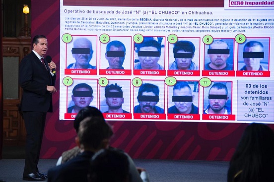 En conferencia en Palacio Nacional, el subsecretario de Seguridad y Protección Ciudadana (SSPC), Ricardo Mejía Berdejo, informó acerca de estas detenciones por parte de la Secretaría de la Defensa Nacional, la Guardia Nacional y la Fiscalía de Chihuahua que se dieron entre el 25 y 27 de junio en los municipios de Cerocahui, Batopilas, Guachochi y Urique.