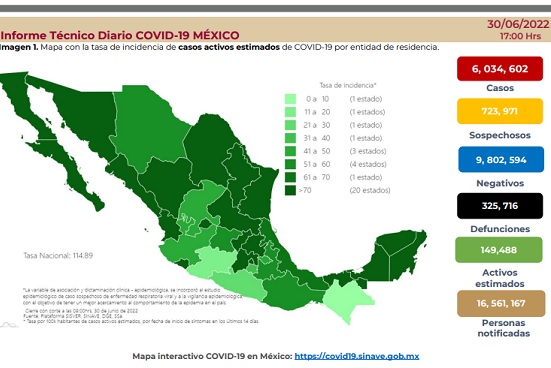 La Secretaría de Salud reportó este jueves 30 de junio 24 mil 537 nuevos casos de Covid-19, con los que México acumula un total de 6 millones 34 mil 602 contagios; en tanto 325 mil 716 personas han fallecido como consecuencia de esta enfermedad, de las cuales 47 fueron reportadas en las últimas 24 horas.