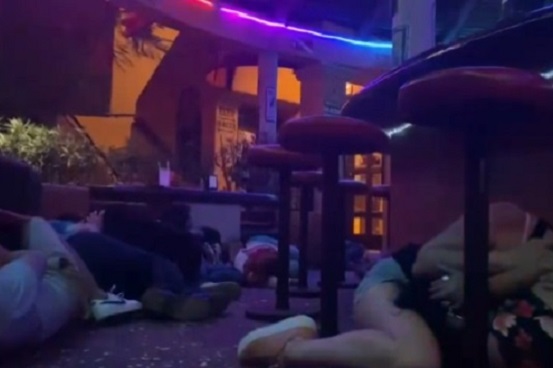 “No se vaya a levantar nadie”, se escucha una voz, mientras varias personas intentan resguardarse bajo mesas y asientos dentro del bar.