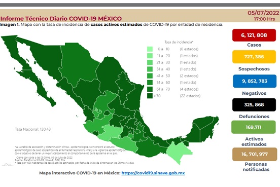 La Secretaría de Salud (Ssa) reportó este martes, 27 mil 973 nuevos casos de Covid-19, con los que México acumula un total de 6 millones 121 mil 808 contagios; en tanto 325 mil 868 personas han fallecido como consecuencia de esta enfermedad, de las cuales 75 fueron reportadas en la últimas 24 horas.