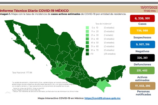 En tanto, 326 mil 261 personas han perdido la vida a consecuencia del coronavirus SARS CoV2 y de ellas, 72 fueron reportadas en las últimas 24 horas.