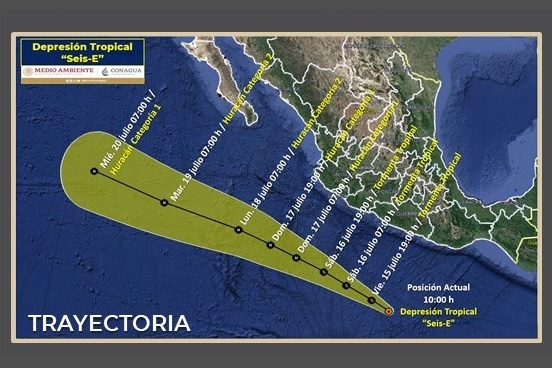 A las 10:00 horas, tiempo del centro de México, en el Océano Pacífico se generó la Depresión Tropical Seis-E, a partir de una zona de baja presión, aproximadamente a 555 kilómetros al sur de Acapulco, Guerrero. Tiene vientos máximos sostenidos de 55 kilómetros por hora (km/h), rachas de 75 km/h y desplazamiento hacia el oeste-noroeste a 13 km/h.
