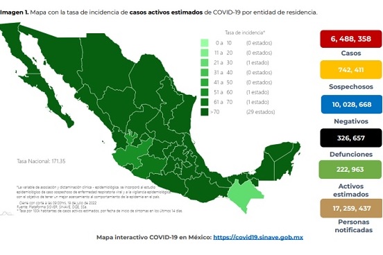 En lo que respecta a los casos activos, aquellos positivos que iniciaron síntomas en los últimos 14 días, se contabilizan 213 mil 611 casos activos, con una tasa de incidencia de 164.2 por 100 mil habitantes (Del 06 al 19 de julio del 2022).