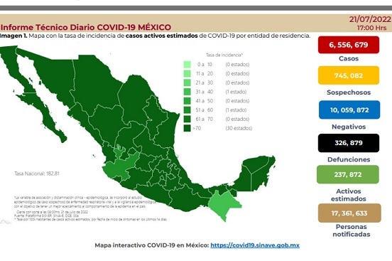 De acuerdo con el informe técnico de la Secretaría de Salud, al corte de este jueves 21 de julio, México acumula 6 millones 556 mil 679 casos positivos y 326 mil 879 defunciones a causa del virus.