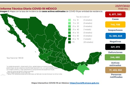 Hasta el cierre de este informe se tenía registro de s 236 mil 974 casos activos en todo el país. Los países con mayor número de contagios son: Ciudad de México, Colima, Baja California Sur, Querétaro, San Luis Potosí, Sinaloa, Coahuila, Tabasco, Tlaxcala y Nuevo León.