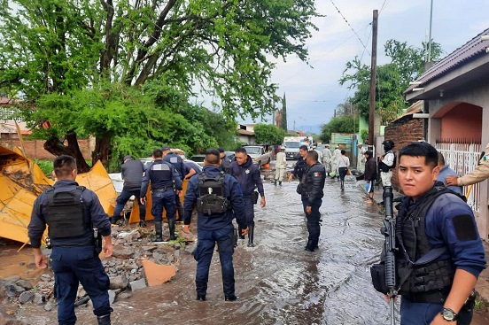 “La fuerte corriente que se formó en la calle Lázaro Cárdenas arrastró vehículos a su paso que los dejó destruidos. Al llegar a la esquina de la calle Colón, quedaron apilados tres automotores, entre ellos una patrulla de la policía municipal”, señala el comunicado de prensa del gobierno del estado.