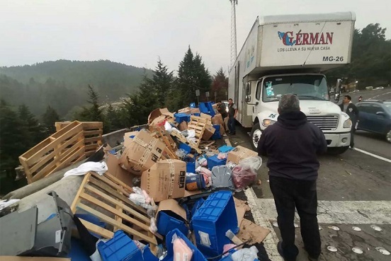 La madrugada de este viernes, un tráiler que transportaba cerca de cuatro toneladas de ropa volcó sobre la carretera México-Toluca a la altura del kilómetro 52 con dirección a la Ciudad de México.